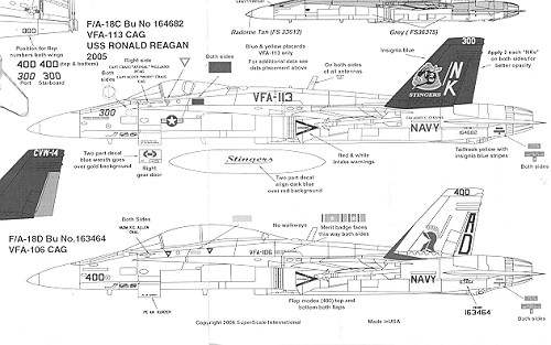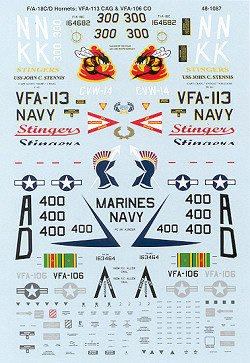 First is the CAG bird from VFA-113, one of the first USN Hornet squadrons. The fin is to be painted insignia blue on both sides. Superscale has provided two sets of tail codes so that there is no problem with the blue bleeding through.