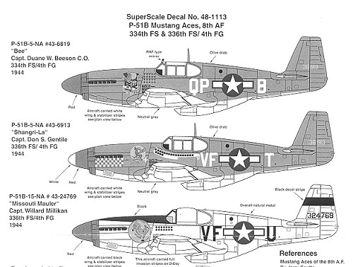 Finally there is the unpainted 'Missouri Mauler' of Williard Millikan. His 336 FS Mustang carries his nose art and 14 victory markings. During D-Day, this plane was in full Invasion stripes should you wish to so paint it.