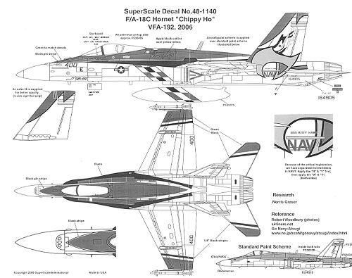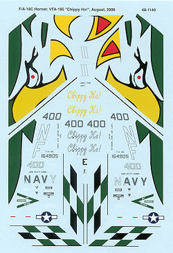 The modeler will need to do some painting with all those green and black areas, but the biggies are given with the sheet. An excellent placement guide is also provided to make this one a real beauty. I should mention that the package and instructions list this as VFA-192, which is incorrect.