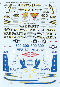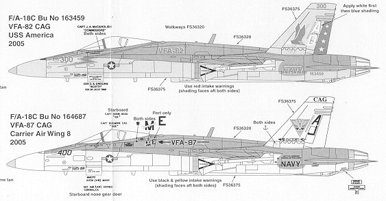 The first on is for VFA-82 and the sheet states that this is a 'Commemorative CAG'. The tail codes are for the training squadron, which leads me to believe that the unit has either disestablished or moved on to the F-18E Super Hornet. Interestingly, the aircraft is marked for the USS America.