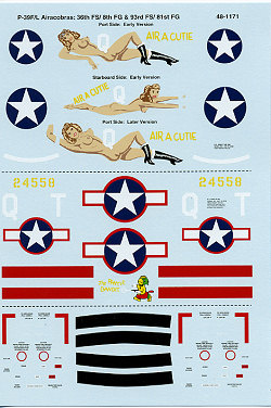 However, what has chanced is the second set of markings. This time it is a P-39L from the 93rd FS/81st FG operating out of Tunisia in 1943. By the time the red surround markings were introduced in June of that year, the Axis was out of North Africa and the invasion of Sicily was underway, so I'm not sure what combat this unit would have seen. If any, it would have been against targets on the western section of Sicily as the P-39 was not a long distance flyer. The aircraft is in the standard OD over Neutral Grey with red wing bands and the name "The Pantie Bandit".