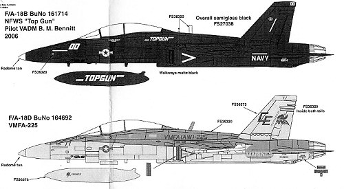 Superscale has provided one new and one old scheme for us this time. The all-new scheme is for the black F-18B flown by the Naval Fighter Weapons School. I'm sure it was included on this sheet because it is an axiom in the scale model business that black airplanes sell, and so do decal sheets for them. The other is for a standard line bird from VMFA-225. I'm not sure if this exact scheme has been printed before, but the unit has several sheets to its credit. No date is given for the Marine aircraft.