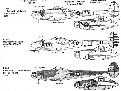 Finally, the P-38G named "Beautiful Lass" with a great nose art from the 9th Fs/49th FG. This OD over Neutral Grey aircraft has red spinners.