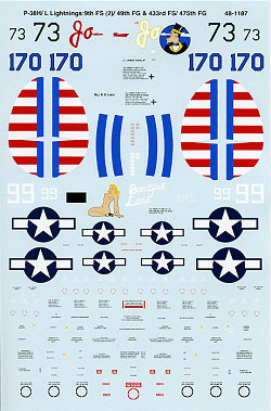 This latest batch finishes up with a pair of P-38s. The recommended kit for these planes is the one from Hasegawa and that is what the markings have been sized for. You could probably use the Academy or Monogram kits if you wished, but might have to do some trimming or additional painting.