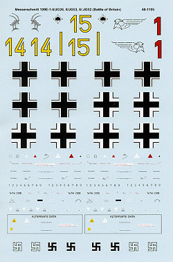 This is a reissue of a 1995 sheet for early Battle of Britain Bf-109E-1s. How do I know? That is the copyright date on the instruction sheet. These planes are all early Battle aircraft without the later yellow ID bits. All are marked as RLM 70/71 over RLM 65 with hard edge splinter patterns and high fuselage demarcation lines. All have black-green RLM 70 spinners.