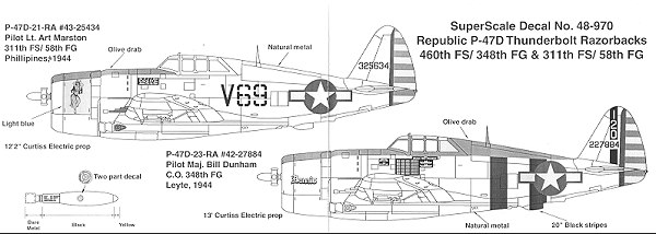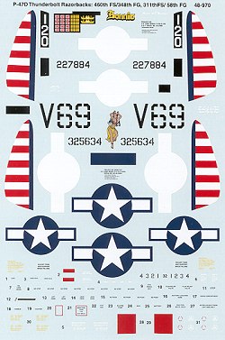The other is from the 460 FS/348 FG and also has the same tail markings. In addition, planes operating out of the Philippines had to have broad black ID bands. In this case, the plane has two on the fuselage and three on the wings. Break out the tape as you'll have to paint them on. This aircraft, named 'Bonnie' also has an OD upper fuselage decking and an impressive score board.