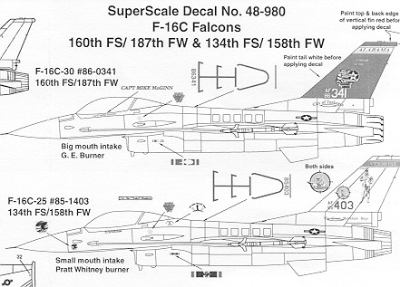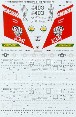 First up is an F-16C-30 with the big mouth intake and GE engine. This one is attached to the 160 FS, Alabama ANG and has a red fin to commemorate the Tuskeegee airmen. The modeler needs to paint the fin white and then touch-up the top of the fin once the decal is applied.