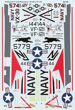 The VF-121 aircraft is one that was operated near the end of it's time and is in the overall gloss gull grey scheme. This is an F-4J and as such uses the shorter RHAWS intake antennas as are used on the S version. As the Phantom fleet drew down, with the introduction of the F-14, VF-121 turned over all training to VF-101 on the east coast and was disestablished.