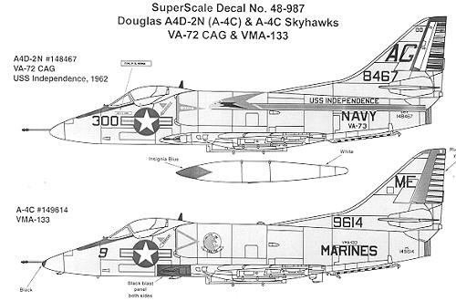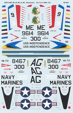 This particular sheet is for the very early versions; the A4D-2N (later redesignated A-4C). Both examples are in the light gull grey and white scheme. The sheet provides both anti-glare panels so you don't have to paint those. There are insignia and data markings for one aircraft. The only kit that is around for this early bird is the very nice Hasegawa version that should still be readily available.