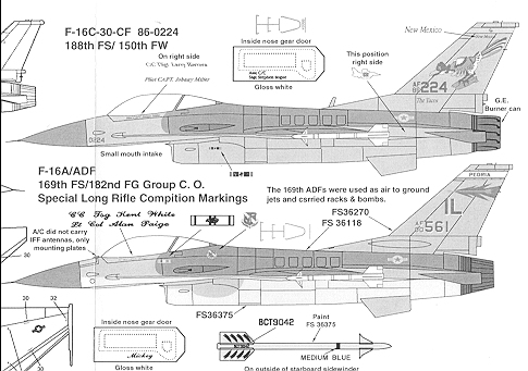 The F-16A/ADF is from the 169 FS Illinois ANG and is in a special scheme for a weapons meet, one of two planes similarly painted. I guess that when they reworked aircraft into the ADF mods, they used the older three color scheme with the addition of FS 36375 on the underside.