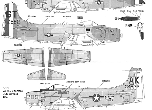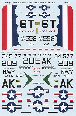 The other is a VA-165 'Boomers' A-1H from the USS Intrepid's 1966 cruise. This aircraft has a large number of mission markings on it. A nice touch is that the insignia for the fuselage are provided in both solid and 'pre cut' versions for placement over the side speed brakes.