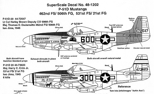 First up is 'Tallahassie Lassie', the plane of Harley Brown, CO of the 506th FG and often flown by Thomas DeJarnette of the 462nd FS. Both planes are unpainted metal and this one has a nice medium yellow tail with unpainted control surfaces.