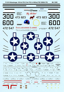 The other is 'My Achin' Ass' from Harry C. Crim of the 531st FS/21st FG. This aircraft has a white spinner with a thin black nose section to match the fin stripe. The black stripes for the wings and tail planes are provided; the modeler needs to paint the white parts.