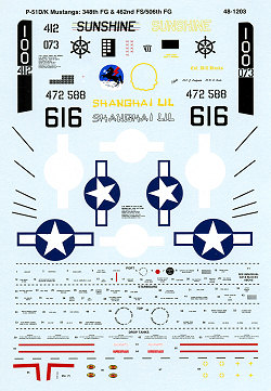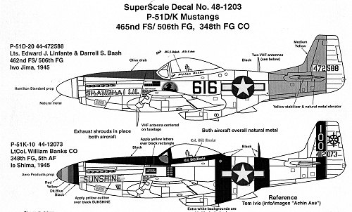 The other is a K model P-51 so 'Sunshine of the 348th FG needs the Aero Products prop. Black 5th AF bands on the wings and fuselage with a multicolored spinner. The instructions show the size of the wing bands. Both the canopy surround and the anti-glare panel are black on this one.