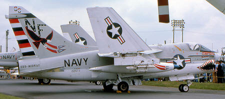 Next is a Bicentennial scheme on a VA-93 plane from Atsugi, Japan in 1976. It is also the CAG bird. From what I recall seeing these planes on the ramp back then, the blue was a lighter shade, but apparently on this one they went with a darker blue. I found a couple of photos that show this below.