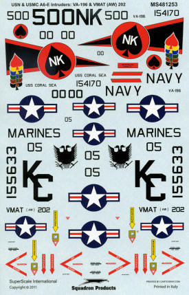 The Navy option is from VA-196 aboard the USS Coral Sea in May of 1981. This is the CAG bird so has the multiple colors on the rudder. It was apparently built as an A-6A and like many A-6Es, converted to that standard. It is a survivor and now resides at the Flying Leatherneck Aviation Museum at MCAS Miramar.