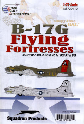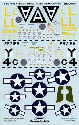 The other is another popular subject, 'Sleepy Time Gal'. This one is with the 353 BS/301 BG in Italy during 1944. It is overall unpainted metal with OD anti-glare panels on the nose and inner engine cowlings. The nose panel is included with the sheet. Both of these planes appear to have the upper nose astrodome, but I'd check references to verify their configuration just to be sure.