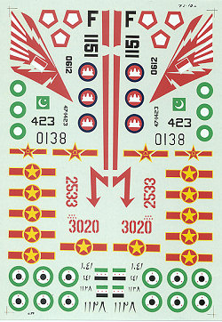 For the MiG-17 there is a Syrian version camouflaged in dark and light green uppers with light blue undersides, a North Vietnamese version in dark green mottle as well as one in unpainted metal with a red fin tip. A Cambodian version with a nice red flash on the side and an Indonesian version with a brillant red tail marking round out the 'Fresco's.