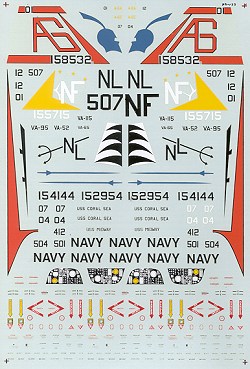 The lone A-6E on the sheet is a pre-TRAM bird from VA-65 with the large orange markings on the tail and fuselage.