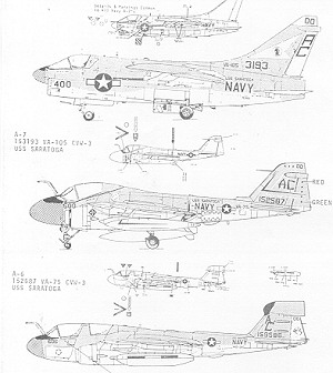 Next is an A-6E from VA-75. This is also a CAG bird with multicolored stars on the fin. This A-6E has not yet been equipped with the FLIR pod as part of the TRAM set-up.