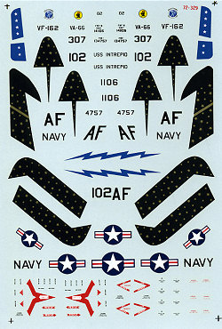 The decal sheet has data markings for both and insignia for one. There are six national insignia, which is a tad odd as you can't do both planes with only six. There is also a larger insignia, but no mate for it, a medium sized one in its place. No mention of this is provided on the markings guide, so I'm at a loss as to why that was done. In fact, the guide doesn't tell you which insignia to use on which plane. I have used the VF-162 markings many, many, many.....well, a long time ago. Do be very careful with setting solutions as the gold doesn't really like them.