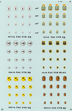 This set is for the 12th TFW. It includes wing badges and badges for the four squadrons in it, the 556th, 557th, 558th and 559th. These badges are for their F-4Cs coded XD, circa 1967. After the war, the unit was disbanded, but reformed with T-37s and T-38s with the 12 FTW. Originally, the 12th was a WWII bomber unit that was later briefly activated to fly F-84s with SAC from 1952-56.