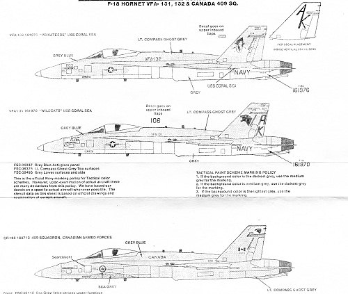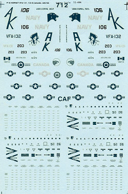 This sheet comes from the early days of the F-18 Hornet as new US Navy units were established to operate the type and it was first being flow by the Canadian Air Force. No kit is suggested for this sheet, but nowadays we have the very nice one by Hasegawa, itself now approaching 20 years old. Canadian planes are painted in a darker grey scheme than the US Hornets. That information is provided on the instruction sheet as well as a data placement guide.