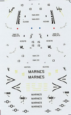 Aircraft are from VMA-223 'Bulldogs', VMA-311 'Tomcats', and VMA-331 'Bumble Bees'. Markings on these planes are rather minimalist so the sheet has a lot of extra space. However, there are enough bits to do two of the planes on the sheet. Those of you with good memories will note right away that this is merely a scaled down version of one of their 1/48 sheets.
