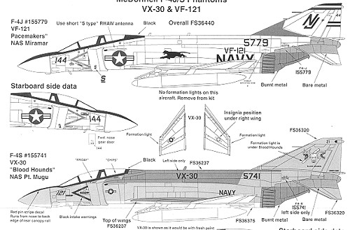 The VF-121 aircraft is one that was operated near the end of it's time and is in the overall gloss gull grey scheme. This is an F-4J and as such uses the shorter RHAWS intake antennas as are used on the S version. As the Phantom fleet drew down, with the introduction of the F-14, VF-121 turned over all training to VF-101 on the east coast and was disestablished.