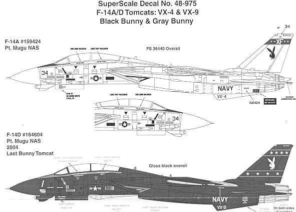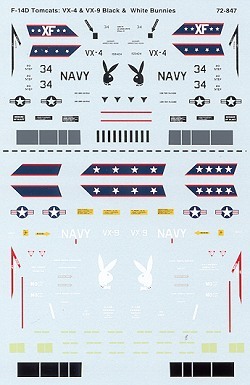 Also on the sheet is one of VX-4s somewhat standard F-14As. This aircraft is in the easy to paint overall FS 36440 Light Gull Grey. The sheet provides markings for both planes and that includes insignia and some data markings. The recommended kit is the Hasegawa version for the, though these markings should fit Airfix, Revell, Italeri and others.