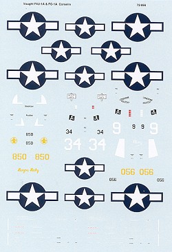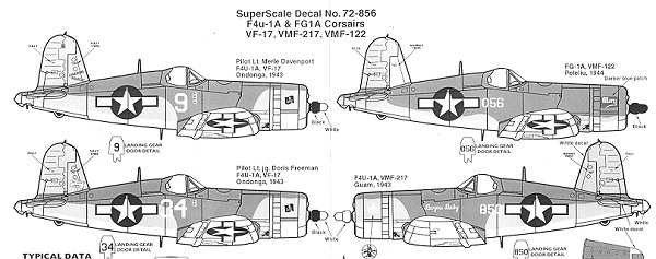 For the Marines, plane white 056 is from VMF-122 at Peleliu in 1944 and named 'Mary'. The second is yellow 850, 'Bayou Baby' from VMF-217 on Guam in 1944. It says 1943 on the sheet, but the island wasn't taken back until 1944. It has white on the extreme rear of the fuselage and edges of the horizontal stabs.