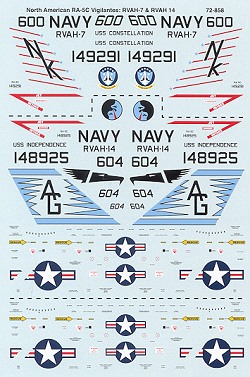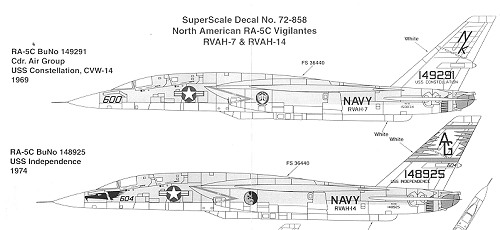 The two aircraft are from RVAH-7 aboard the Connie in 1969, and an RVAH-14 aircraft from the Indy in 1974. Both of these are in the light gull grey and white scheme. They are both early build aircraft so you may have to modify your kit if it has the extended wing strakes. These need to be removed and is a relatively simple operation.