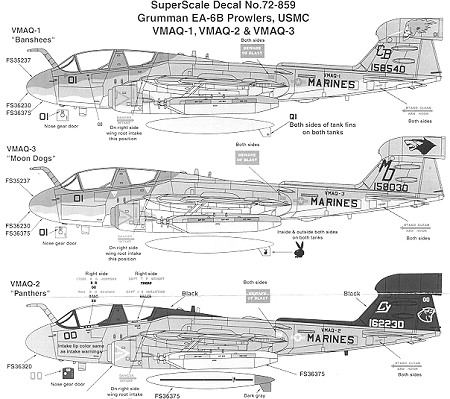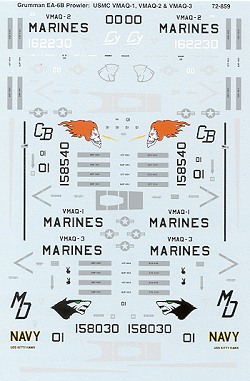 This sheet offers markings for three of the four USMC EA-6B units. All of them are the the tactical paint scheme of FS 35237, 36230, 36375, with one exception. That is the last plane which has forsaken that for an overall 36320 scheme.