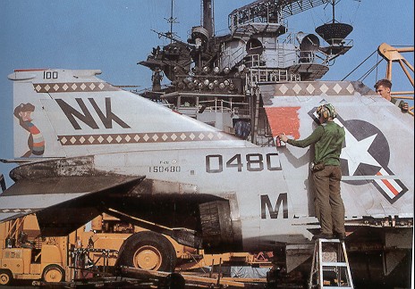 The F-4N is from 1980 and not only does not have a white radome, but the upper flight control surfaces were not white either. According to sources, the aircraft was overall Light Gull Grey. The fin is very dark blue (insignia blue) on this CAG bird. If this aircraft was being readied for the Iranian hostage rescue operation, then it should have bands on the outer portion of the right wing These bands were one broad orange one flanked by two narrower black versions. Below is an image of these being painted on a VMFA-323 F-4N.