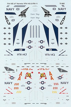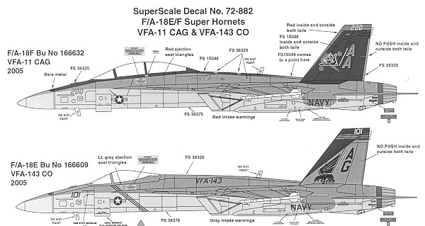 This one includes the CAG bird from VFA-11 with its red fin tips and sea blue tail/upper decking. Interestingly, this sheet calls for FS 15044 for the dark blue whereas the 1/48 sheet calls for 15042. Really, either one will be just fine. You'll note that on these blue or black tailed aircraft. the very end of the rudders are left in the camouflage color.