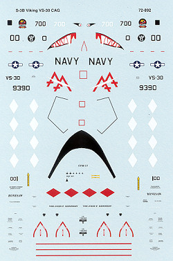 This sheet is for the CAG bird from VS-30 and one of the few Vikings to ever sport a sharkmouth. The aircraft is, for all purposes, overall FS 36320 and is probably a bit ratty. The wing tip pods seem to be painted an overall matte black and they might as well have been as all the ASW electronics and probably the ESM suite was disabled years ago when the mission went away. The sheet provides doubles of the white rudder diamonds to prevent the red from bleeding through and there are all the intake warnings and sonobouy chute warnings you would want on the decals. Even a nose anti-glare panel, making this an especially complete sheet.