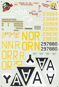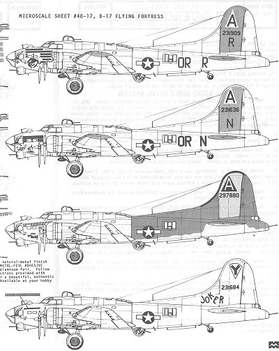 You are looking at Microscale's first 1/48 B-17 sheet (for those of you interested, their first 1/48 sheet of any kind was for the P-51D Mustang). It has some real classics on it. Then as now, the only kit is the Monogram B-17G. Only unique markings are included so you have to scrounge for the common ones like insignia. Though it doesn't look like it, all of them are OD over Neutral Grey with one semi-exception!