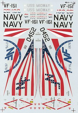 First is the VF-151 plane with red, white and blue tail markings. The fin must be painted white prior to decal application. There are also r,w,&b stripes surrounding the canopy and red/white 'sunburst' markings on the upper wing outer sections.
