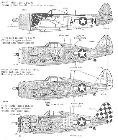 Finally, from the 319 FS/325 FG is this checker tailed P-47, 'Dallas Blonde'. The checks are part of the decal sheet and one simply paints the tail to match the cowling stripe's yellow.