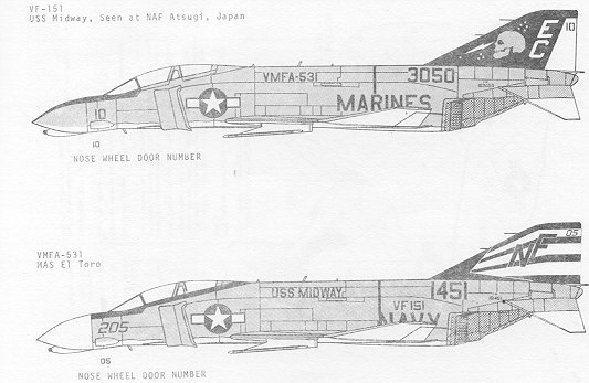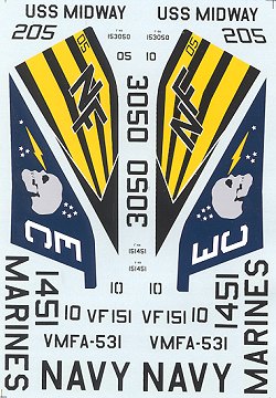 Both aircraft are in the light gull grey over white with white control surfaces. The VF-151 aircraft has a white radome. You'll notice that the unit info doesn't match the actual drawings. These things happen quite frequently from decal makers. You'll also notice that the VF-151 bird has a black surround to the cockpit canopies. Thanks to the accepted practice of applying rather flamboyant tail markings, Navy and Marine planes of the time were properly colorful.