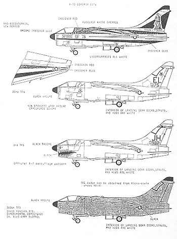 The third scheme is a nice shark-mouthed A-7D from the 3rd TFS in Thailand during the last years of the Vietnam War. It is in standard SEA camouflage.