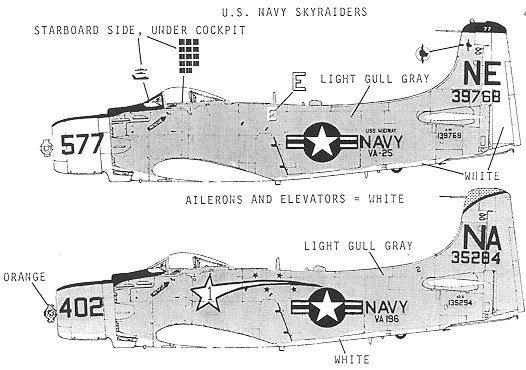Both aircraft on this sheet are in the light gull grey and white scheme. In both cases, insignia will have to come from an alternate source. If doing either of these schemes, you'll have to really grunge up the planes as Skyraiders were anything but clean!