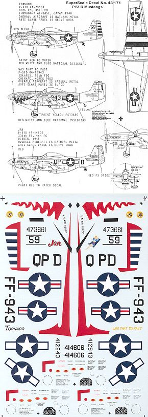 Superscale sheet # 48-171 is for a nice selection of P-51D Mustangs. All of them are in Aluminum/Natural Metal. The Korean war aircraft has a black anti-glare panel while the other two have it in olive drab.