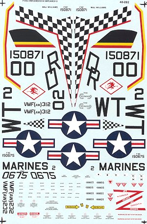 It is the VMF-312 bird that has all the glitz on this sheet. And it should as it is the unit commander's aircraft as indicated by the 'Double Nuts' or two zeros modex on the nose. Undoubtedly, most modelers will choose this scheme to build!