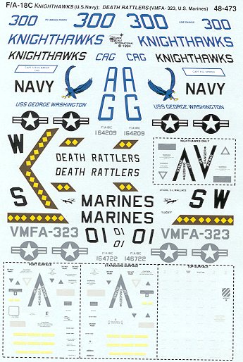 This sheet has markings for two aircraft, both in the TPS scheme for F-18Cs. There are enough decals to do one full aircraft, though the other scheme could be done using aftermarket or kit data decals.