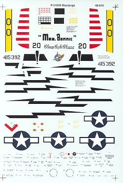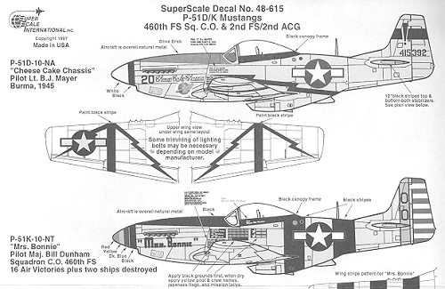The other aircraft is from the 460th FS and piloted by Maj. Bill Dunham. This one has quite a bit of color to it , especially on the tail. There are also a number of large, black stripes that will need to be painted on the wings and fuselage. It will be fun trying to paint the spinner as well with its bands of red, yellow, dark blue and black! This particular plane sports Maj. Dunham's 16 kills.