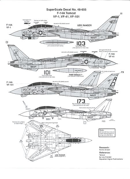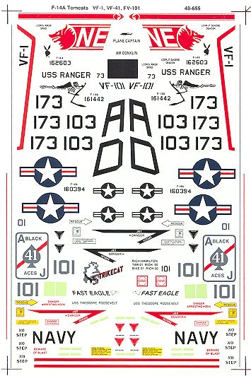 Anyway, that aircraft as well as the VF-101 example is in overall FS 16440 gloss gull grey. The VF-41 Tomcat is in the Tactical Paint Scheme (TPS), and includes the 'StrikeCat' logo for those 'Bombcats' that are capable of performing the air-to-ground mission. There are sufficient insignia and stencils to do two aircraft. The VF-1 and VF-41 aircraft have full color markings, while the VF-101 aircraft has the black markings. There is only one 'NAVY' marking for the rear fuselage provided, so in reality, using only these markings, only one aircraft can be done.