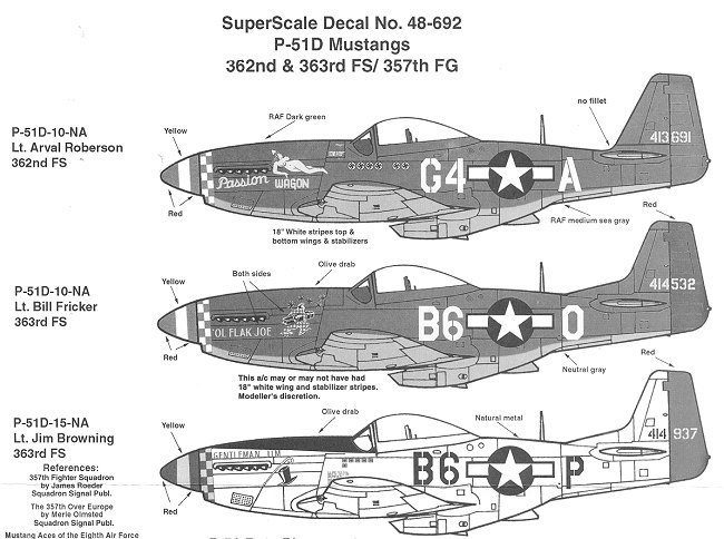 To prevent confusion regarding the P-51 and similar looking German aircraft, the Mustang often carried 18 inch wide white stripes on the wings and tailplanes on OD painted planes. When natural metal took hold, these stripes were painted black. Not all aircraft carried these ID markings, and Superscale indicates which did or if there is any doubt to check photos.
