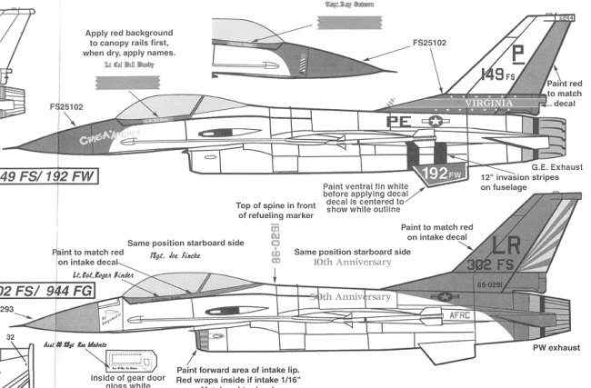 The other F-16c is from the 302 FS. This one is fully outfitted with the red tail of this famous WWII unit. It also has a red intake section with red wing tips (missile rails) as on the WWII birds. There is a red and yellow 'nose' marking around the intake and yellow stripes need to be painted around each wing (or you can use yellow decal stripes). A most flamboyant color scheme that will be hard to miss!
