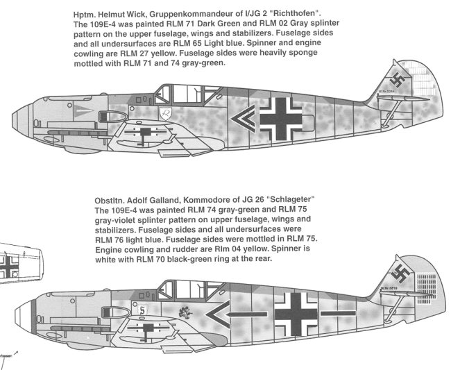 First is Helmut Wick, Kommandeur of I./JG 2. His 109E-4 is in RLM 71/02 upper and RLM 65 undersurfaces. His aircraft has a yellow nose, as was common with aircraft operating from French bases and has a rather heavy mottling on the fuselage sides in RLM 71/74. This mottling was done with a sponge so isn't the soft-edged stuff that came later on.